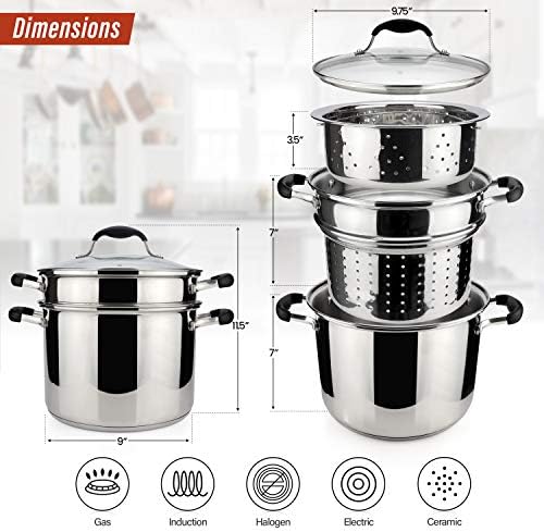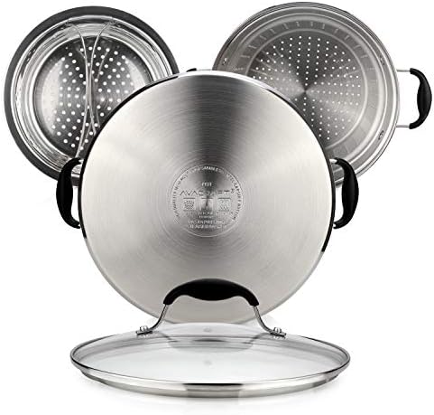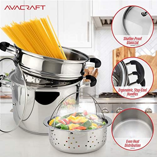 This pasta pot set is perfect for everyday use, offering versatility in both cooking and steaming. The 18/10 stainless steel construction ensures durability and resistance to rust and crack. The 7-quart capacity provides ample space for larger batches, making it ideal for family meals or multi-tasking in the kitchen. The shatterproof glass lid with steam vent ensures safety, while the ergonomic handles allow for easy and comfortable use. The stainless steel strainer efficiently drains cooked pasta or proteins, and the heat-retentive design ensures even cooking for better flavor and texture.